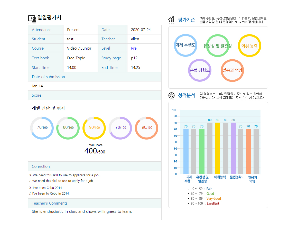 학습평가서를 통해 피드백으로 받아 봄으로써 자신의 문제점을 수정하고 개선할 수 있습니다.