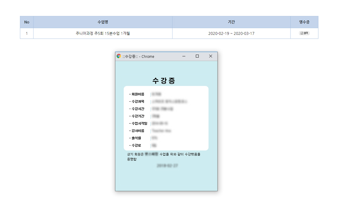 현재 수강중인 수업과 종료된 수업에 관련된 기본 정보를 확인할 수 있으며, 신청일 기준으로 영수증 출력이 가능합니다.